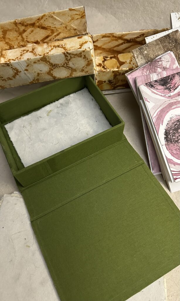 Protect your books, store your paper, stationary, and treasures in your own handmade box, folio and vessel. Learn to measure and create templates. Explore mixed media processes like Cyanotype, natural dyes and pigments as well as paints and prints while preparing cover papers and book cloth. Leave the workshop with at least three completed works along with the templates, knowledge and confidence to continue at home.
