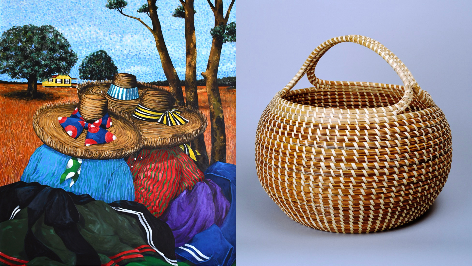 The exhibition brings together a selection of Green’s paintings in conversation with traditional Gullah Geechee crafts, including sweetgrass baskets, quilts, and Adinkra printed cloth. Green’s paintings are a fusion of contemporary style and cultural history, and often feature dynamically colored cloth and beautifully designed craft objects. They are complemented by examples of Gullah Geechee basketry, a craft born out of necessity on coastal plantations and passed down through the generations, the vibrant quilting tradition, and the West African Adinkra symbols that link Gullah Geechee expression to deep ancestral knowledge.